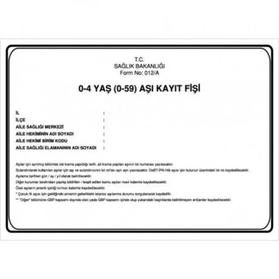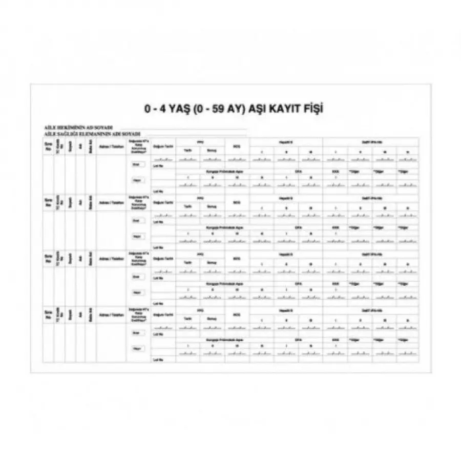 Aşılamanın gün / ay ve yıl olarak kayıt altına alınabileceği 0 - 4 yaş aşı kayıt fişi üzerinde aşı numarası ve aile hekimine dair bilgilerin de yazılabileceği tüm bölümler bulunmaktadır. Aşı kayıt fişi 25 yaprak ve toplamda 50 sayfadan oluşmaktadır. Spiralli plastik dosya içerisinde yer alan fişler kaliteli kağıt üzerine basılmıştır.
