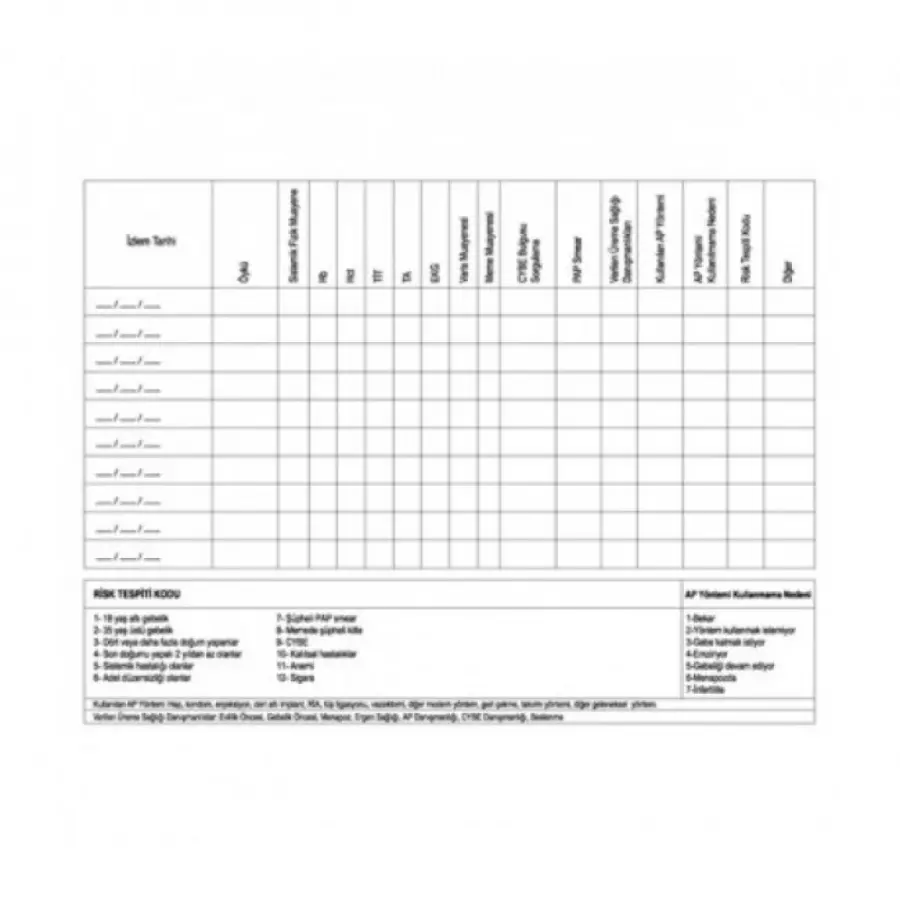 Yerli Bristol karton üzerine basılmış olan 15 – 49 yaş kadın izlem fişi kayıtların kısa sürede tutulmasını sağlar. İzlem fişi Sağlık Bakanlığı Ana Çocuk Sağlığı Genel Müdürlüğü verilerine göre güncellenmiştir. 1 paket içerisinde 100 adet izlem fişi yer almaktadır. Fiş içerisinde kimlik ve ikametgah bilgileri, cinsel sağlık ve doğurganlık bilgileri, alışkanlıklar, sistemik hastalıklar gibi pek çok bilginin kaydedilebileceği bölümler mevcuttur.