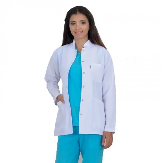 - Beyaz renkte ve uzun kollu olan laboratuar önlüğü alpaka kumaş kullanılarak üretilmiştir.