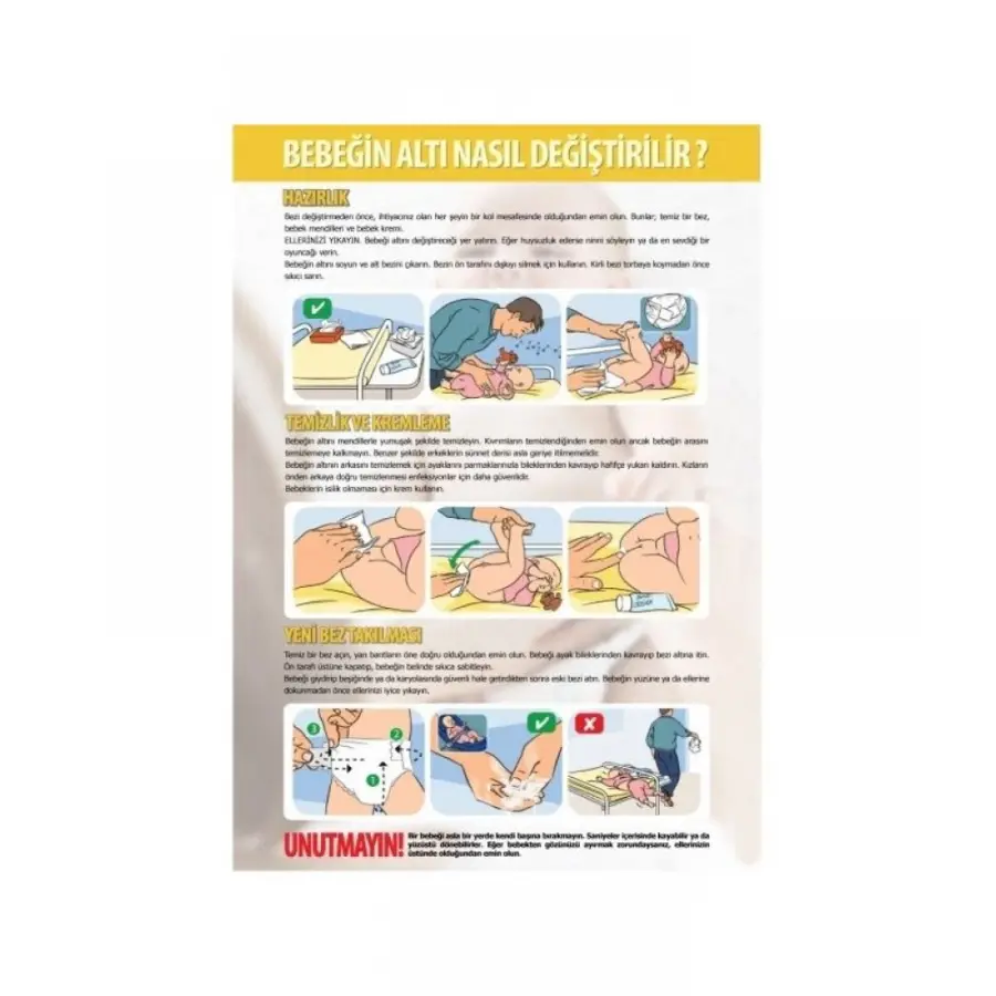 A3 boyutlarında tasarlanmış olan Bebek Alt Değiştirme Talimatnamesi; 1 sınıf kuşe kağıda basılmıştır. Renkli baskı teknolojileri kullanılarak tasarlanan bu ürün; üst kalitede bir baskıya sahiptir.