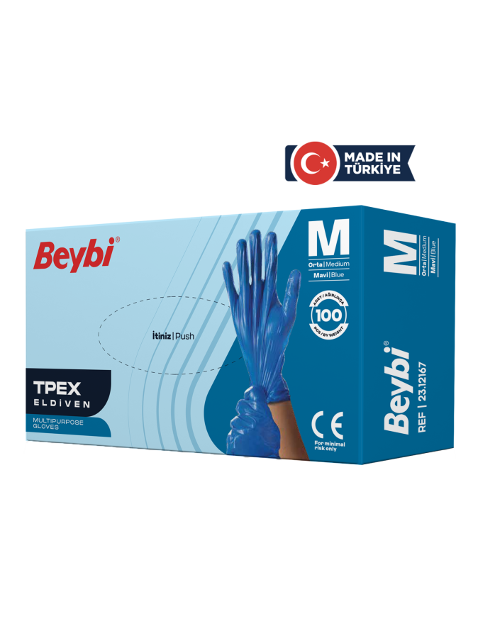 TPEX Mavi Eldiven, hijyen ve dayanıklılığı bir araya getiren, Termoplastik Elastomer (TPE) malzemeden üretilmiş üstün kaliteli bir üründür. TPE, esnekliği, yıpranmaya karşı dayanıklılığı ve hafifliği ile diğer malzemelere kıyasla üstün performans sunar. Bu özellikler, uzun süreli kullanım sırasında konfor sağlarken, geniş kullanım alanlarına uyum göstererek hem profesyonel hem de günlük işlerde pratik bir çözüm sunar. Lateks, nitril ve vinil içermediği için cilt hassasiyetine uygun güvenli bir kullanım sunar. %100 gıda temasına uygun olarak üretilen bu eldivenler toksik madde içermez ve kokusuzdur, bu da özellikle gıda hazırlığı gibi hassas işlemler sırasında güvenli bir kullanım sunar. Çevre dostu tasarımı ile hem profesyonel hem de günlük kullanımlar için mükemmel bir çözümdür.