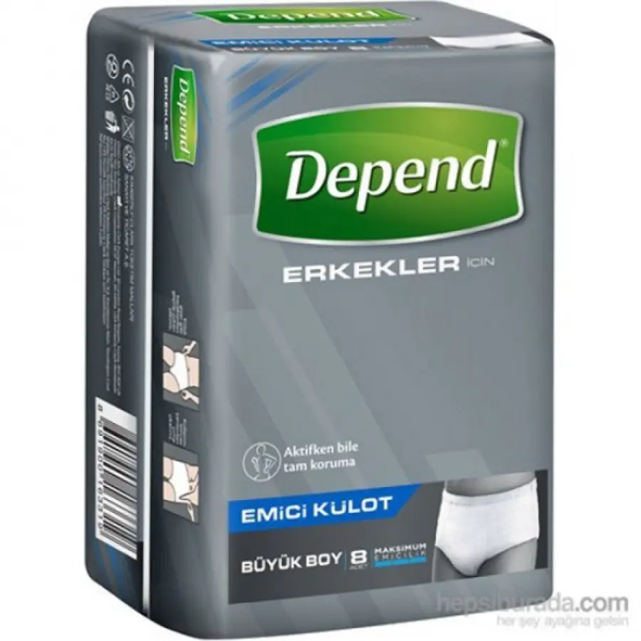 Depend Erkek Külotlu Hasta Bezi yalnızca büyük boy üretilmektedir ve paket içerisinde 8 adet külotlu hasta bezi bulunmaktadır.