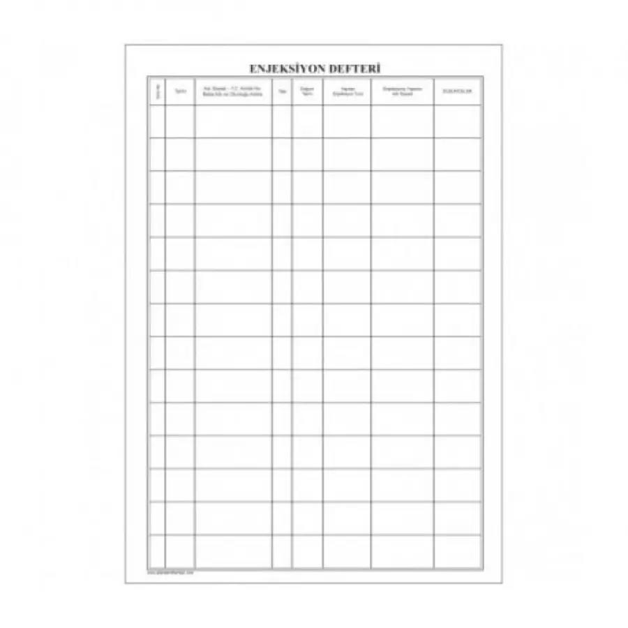 Tüm enjeksiyon uygulamalarının kayıt altına alınması, arşivlenebilmesi ve sağlıklı bir şekilde takip edilebilmesi amacıyla tasarlanmış olan enjeksiyon defteri toplam 75 yaprak, 150 sayfadır. Enjeksiyon defterinin kapakları kuşe karton üzerine basılmıştır. Defter üzerinde gerekli tüm bilgilerin kaydedilebileceği tüm alanlar yer almaktadır. Ürün tüm sağlık kuruluşlarında kullanım için gayet idealdir.