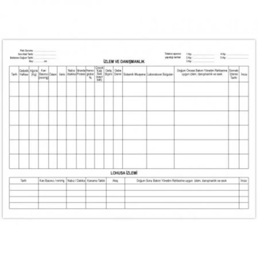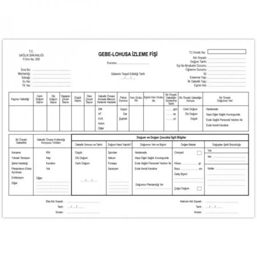 Sağlık Bakanlığı Ana Çocuk Sağlığı Genel Müdürlüğü tarafından belirtilen bilgiler doğrultusunda hazırlanmış olan gebe – lohusa izleme fişi yerli briston karton üzerine basılmıştır. Gebe ve lohusalığa dair tüm bilgilerin kısa sürede kayıt altına alınmasını sağlar. Fiş üzerinde kimlik bilgilerinin yazılabileceği alan da bulunur. Her bir pakette 100 adet form bulunmaktadır.