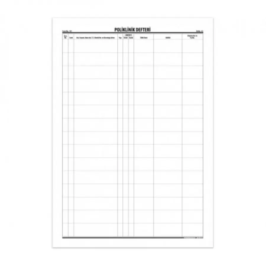 Polikliniklerde gerçekleştirilen uygulamaların kayıt altına alınması amacıyla tasarlanmış olan poliklinik defteri pratik bir kullanım sunar. Tablo formunda tasarlanmış olduğundan tüm veriler kolaylıkla kayıt altına alınabilir ve arşivlenebilir. Defter gerekli takibin yapılması amacıyla da kullanıma uygundur. Defter kapakları kuşe karton üzerine basılmıştır. Toplam 75 yaprağın bulunduğu defter 150 sayfadır.