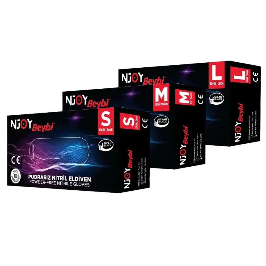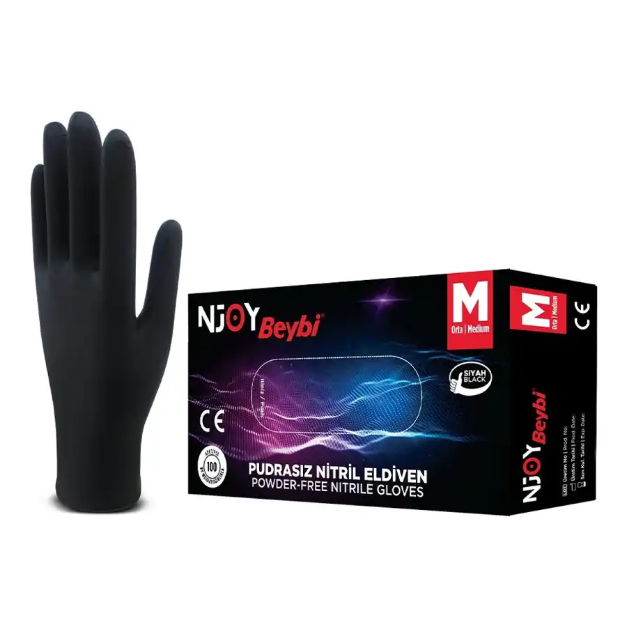 Beybi Pudrasız Njoy Siyah Nitril Muayene Eldiveni, gıda sektöründen sağlık kurumlarına kadar geniş bir kullanım alanına sahip. Pudrasız yapısı deri tahrişi riskini azaltıyor. Pütürlü parmak ucu sayesinde ıslak ve kuru yüzeylerde güvenli tutuş sağlıyor. Lateks içermiyor, dolayısıyla lateks alerjisi olanlar rahatlıkla kullanabiliyor. Tek kullanımlık bu eldiven, çapraz kontaminasyonu önlemek için tasarlanmış. 100'lük kutularda sunuluyor ve S, M, L beden seçenekleri mevcut.